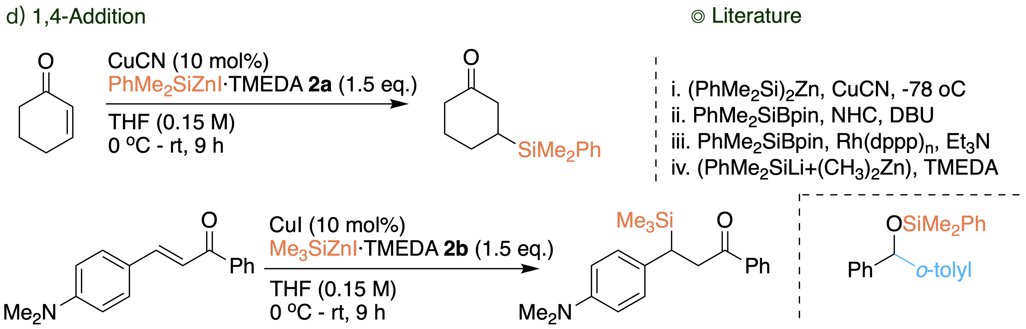 The copper-mediated 1,4-addition of Me3SiZnI and PhMe2SiZnI with enones and yielded the β-silyl ketones. We also employed PhMe2SiZnI in a novel Brook-rearrangement/cross-coupling of benzaldehyde and bromoarene.